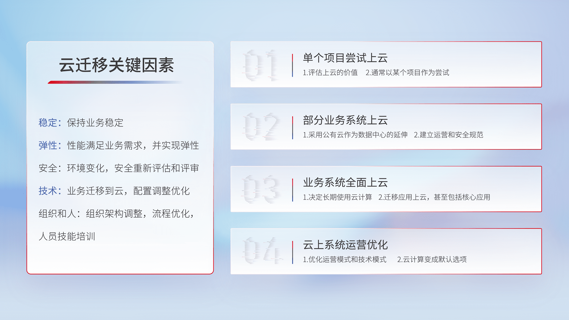 结合实际业务,,从规划设计、、云平台选型、、、云原生改造、、、数据迁移、、集成交付,,迁移全过程为客户识别最佳上云路径,,做好风险识别管理,,设计网络架构、、身份权限、、、安全审计合规、、操作审计、、日志审计、、、、监控告警策略、、、多站点容灾设计等,,,,对云上基础设施进行整体规划,,,提升IT治理水平,,以满足弹性、、、、高可用、、高性能的需求。。