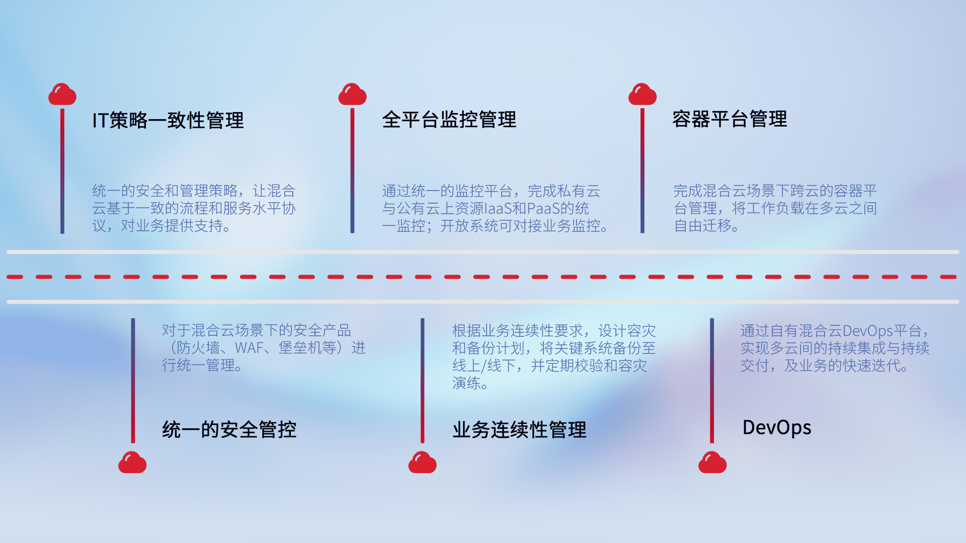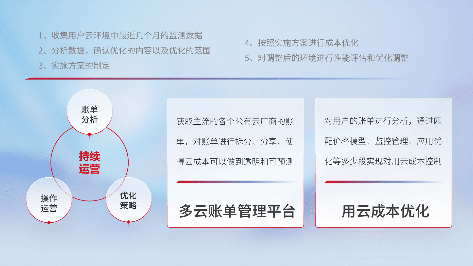 通过多云纳管,,,以统一的资源数据模型把客户的云资源进行抽象和封装,,进而实现对多云资源的统一操作,,,,保障云资源管理的可靠性、、、稳定性与可用性。。。量身定制化运维内容,,,配置、、、开发运维、、、、补丁管理、、、、备份、、监控、、认证和访问管理、、审计和日常巡检等,,保障在用云过程中的可靠度,,,稳定度以及高可用率。。。。