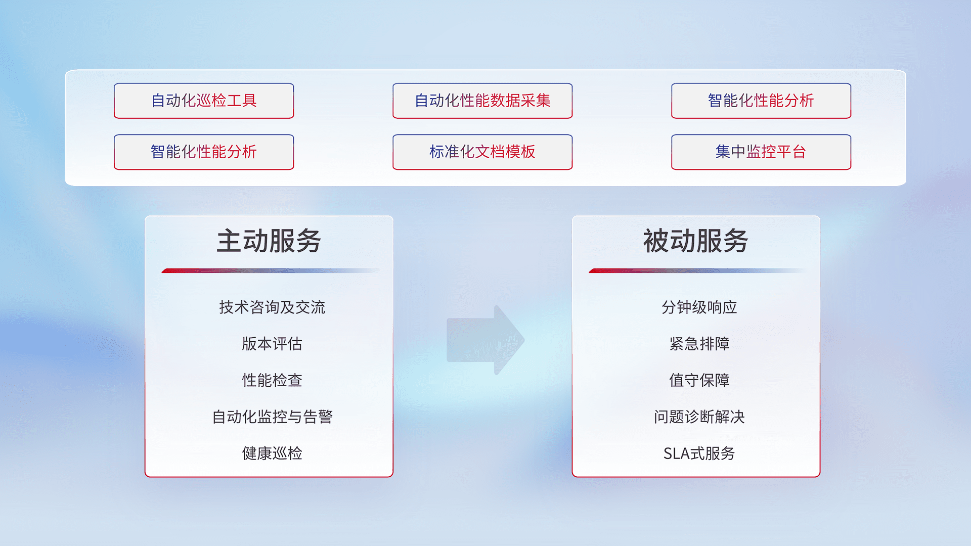 智能化工具和标准化文档,,,保障服务质量,,,提供主动服务(包含技术咨询、、、、版本评估、、、、性能检查、、、、自动化监控与告警、、、、健康巡检)和被动服务包含(分钟级响应、、紧急排障、、值守保障、、、问题诊断解决、、、、SLA服务)。。。
