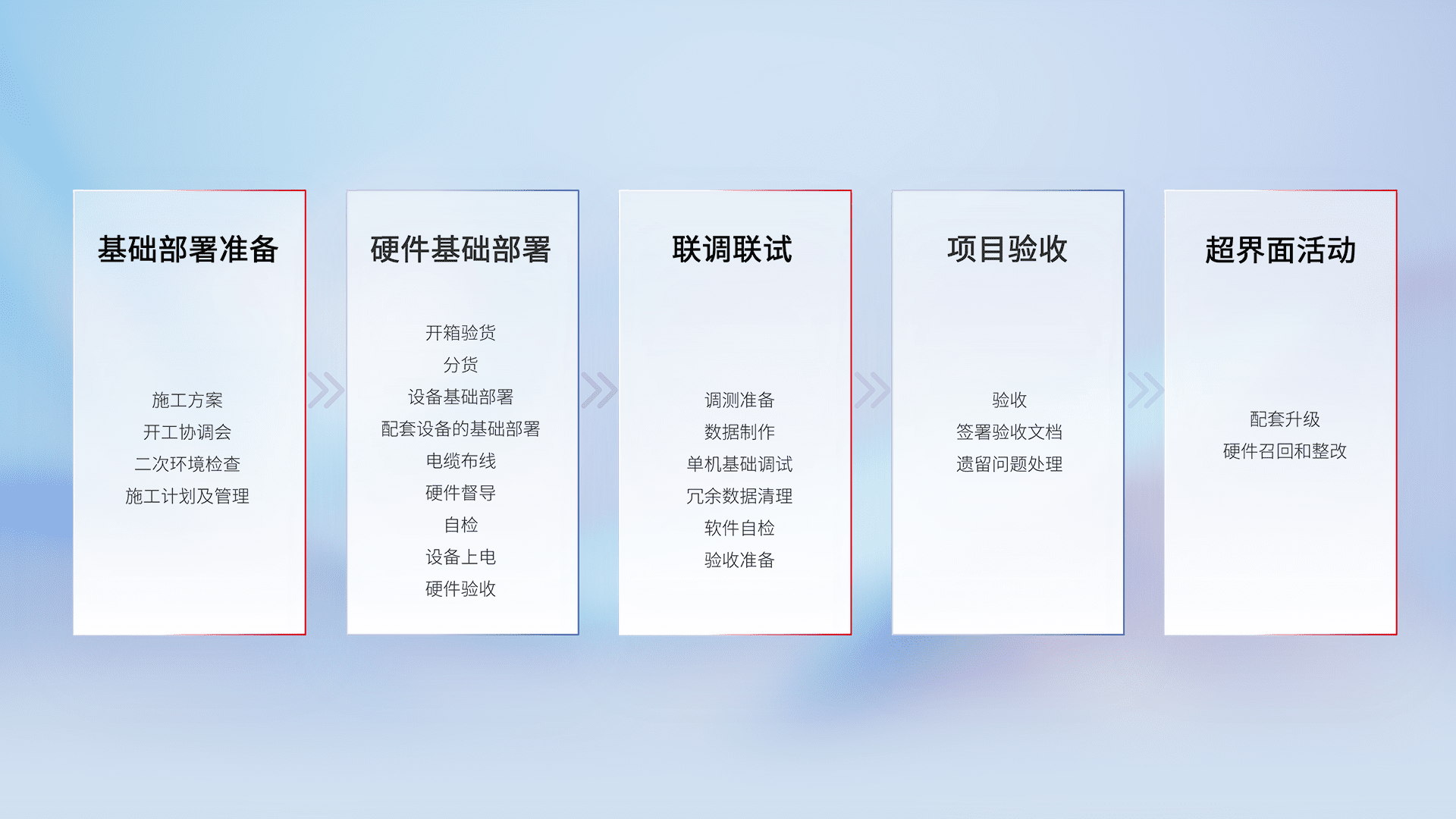 从基础部署准备、、、硬件基础部署、、联调联试、、、项目验收、、、、越界面活动的全过程可追溯,,保证施工质量和进度。。